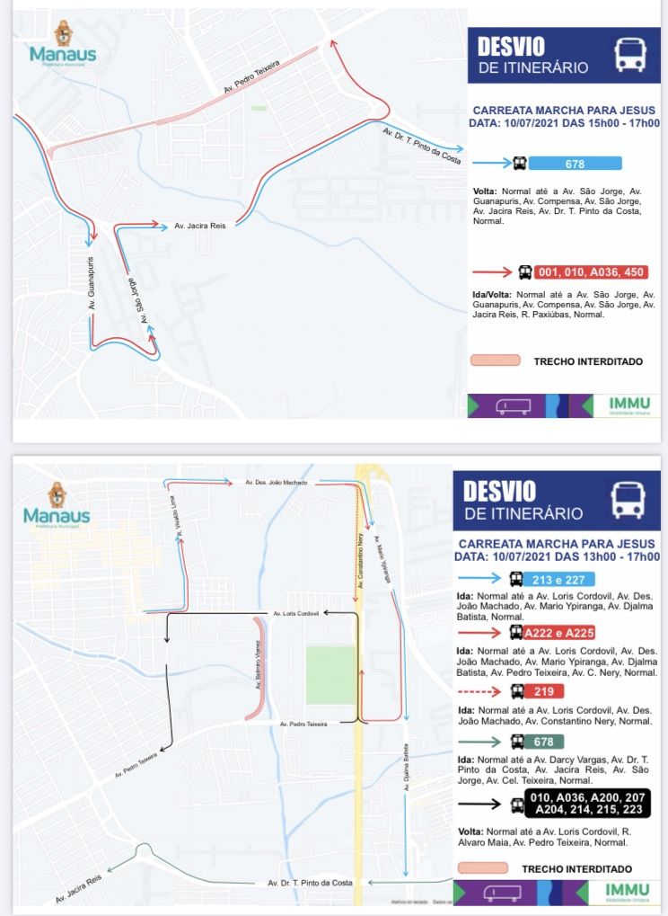A “Carreata para Jesus” irá se concentrar na avenida Belmiro Vianez, via ao lado da Vila Olímpica, a partir das 12h, com percurso seguindo pela avenida Pedro Teixeira em direção à avenida Coronel Teixeira, depois irá se concentrar no Complexo Turístico Ponta Negra. Para garantir a segurança na via, o IMMU optou em liberar o evento no modelo da faixa liberada, com interdição às 6h, com desvio dos veículos para acesso na rua Alaska.