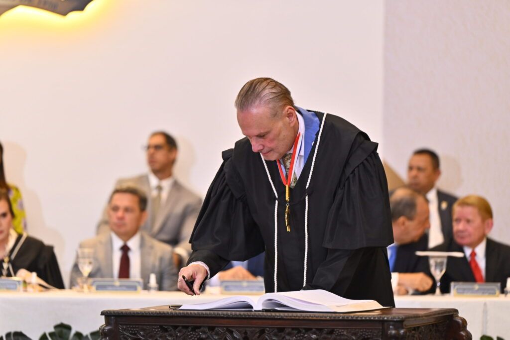 “Recebo com profunda honra e humildade a recondução ao cargo de presidente desta Casa e agradeço, de coração, a confiança que novamente depositam em mim. Assumo esta missão com humildade, mas também com coragem e senso de responsabilidade, pedindo o apoio de todos para seguirmos construindo um Tribunal íntegro e comprometido com aqueles a quem servimos”, afirmou.