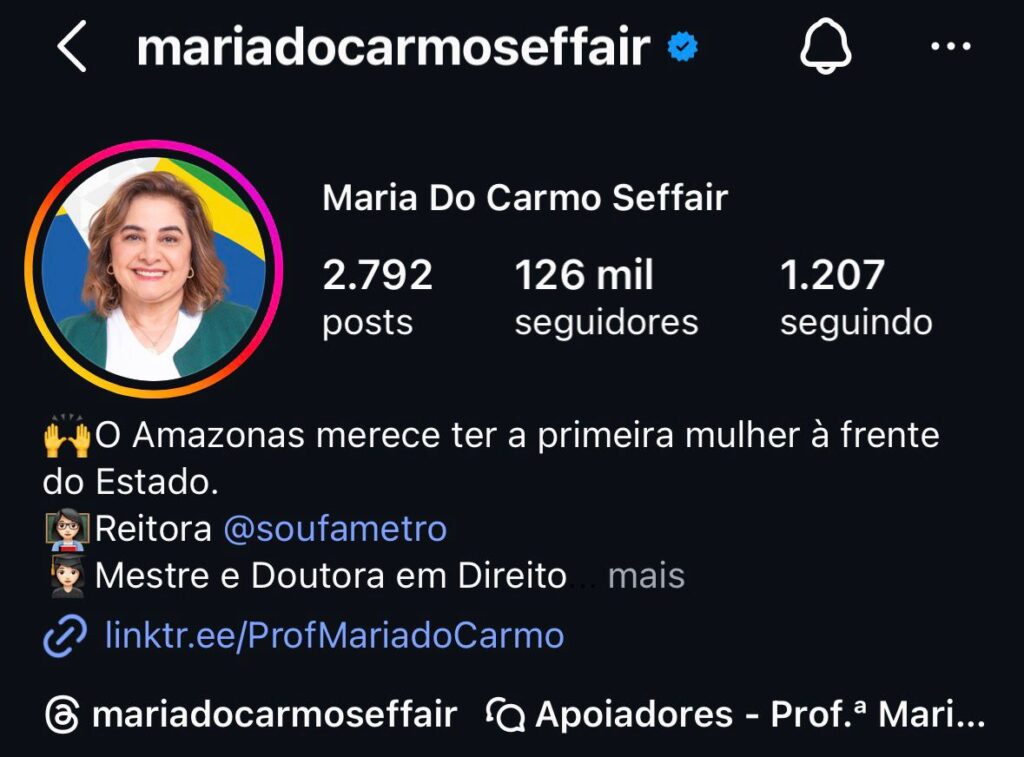 O crescimento da pré-candidata ao governo Professora Maria do Carmo (PL) nas pesquisas de intenções de voto para as eleições deste ano é reflexo tanto de suas movimentações junto ao eleitor, corpo a corpo nas ruas de Manaus e do interior, como também pela ampliação da sua presença nas redes sociais. Na internet, a Professora Maria do Carmo já ultrapassou o senador e também pré-candidato ao governo Omar Aziz (PSD) em números de seguidores.