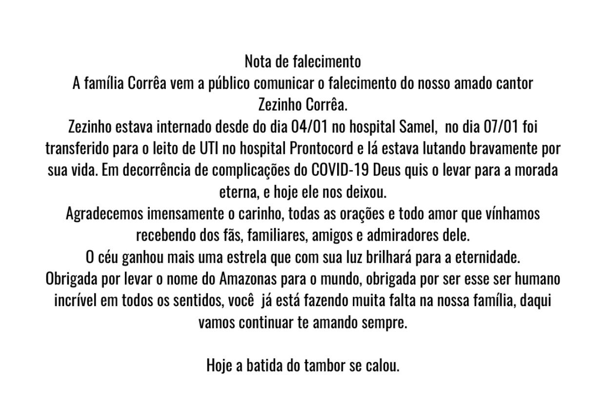 Zezinho Corrêa foi internado com Covid-19 no dia 5 de janeiro, após sentir febres e dores no corpo no dia anterior. Na unidade de saúde, ele recebeu medicação e fez fisioterapia pulmonar. No dia 7, foi transferido para um leito de UTI de um hospital particular de Manaus, para dar continuidade ao tratamento.