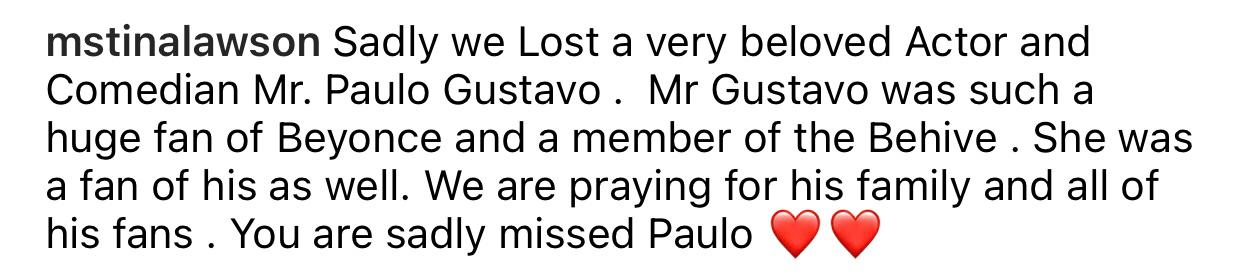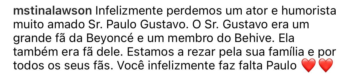 Depois de Beyoncé lamentar a morte de Paulo Gustavo em seu site oficial, foi a vez da mãe da cantora. Tina Knowles fez uma postagem em homenagem ao ator no Instagram, e afirmou que a filha era fã dele: “Infelizmente, perdemos um ator e comediante muito amado, o Sr. Paulo Gustavo. Sr. Gustavo era um grande fã da Beyoncé e um membro da behive [comunidade de fãs da cantora]. Ela era fã dele, também.”.