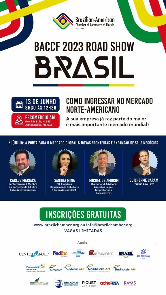 Promovido pela Câmara de Comércio Brasil-Estados Unidos da Flórida (BACCF), será realizado na sede da Federação do Comércio do Amazonas (Fecomércio AM) o workshop: “Como ingressar no mercado norte-americano”. O evento será realizado no dia 13 de junho (terça-feira), das 08h30 às 12h30, na Fecomércio AM, situada na Rua São Luiz, n.555, bairro Adrianópolis.