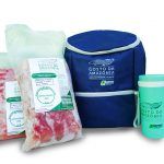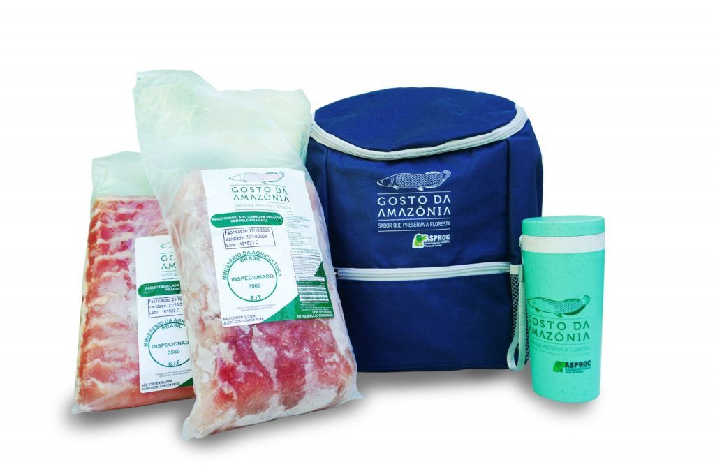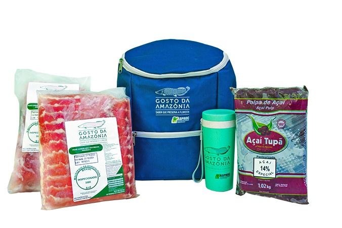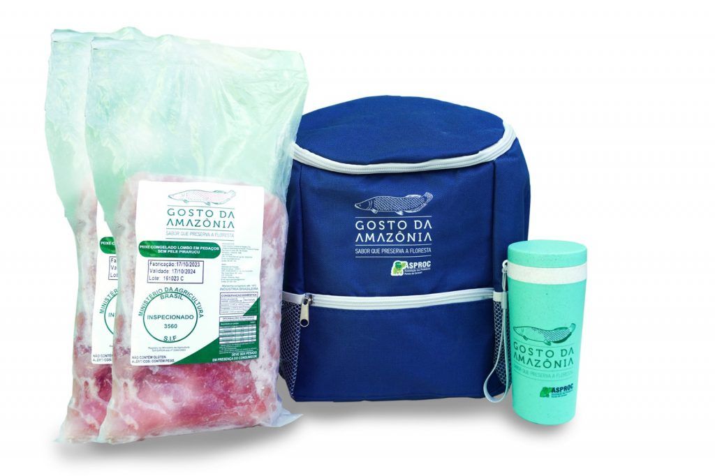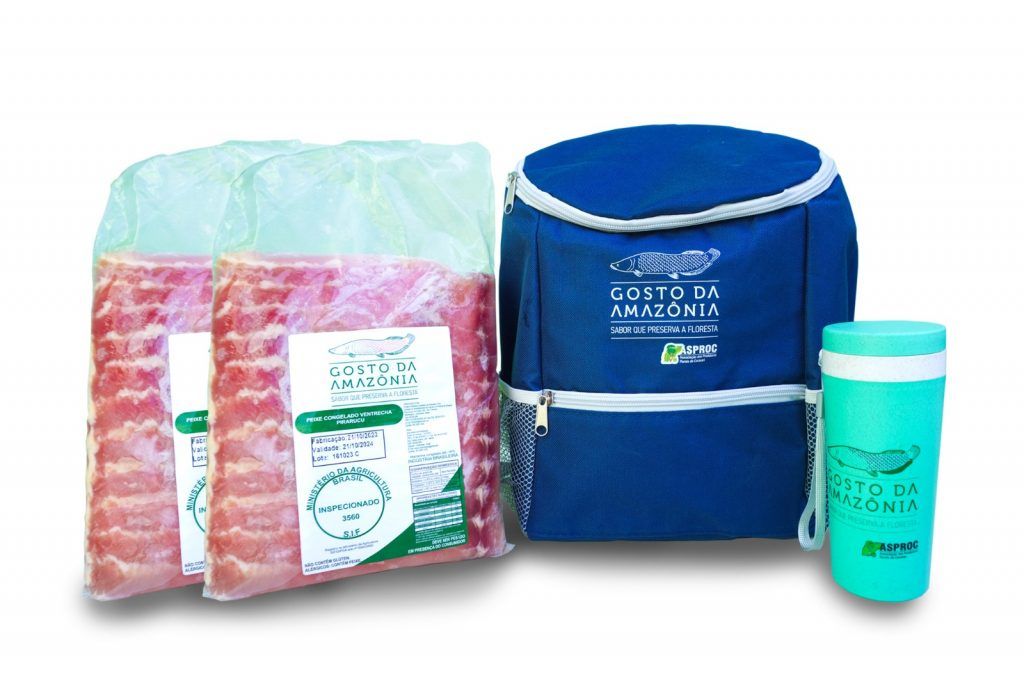 Os kits têm valores que variam de R$ 130 a R$ 155. O primeiro acompanha uma mochila térmica, um copo de fibra de bambu personalizado e duas peças de ventrecha de pirarucu de 1,4 kg cada. O segundo tem uma mochila térmica, um copo de fibra de bambu personalizado, uma peça de ventrecha de 1,4 kg e uma peça de lombo de pirarucu de 1,6 kg.