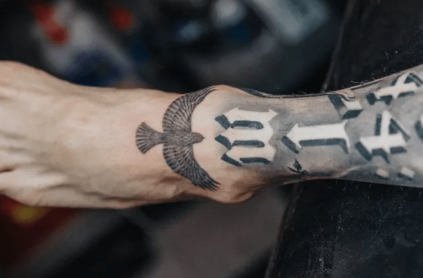 “Falcão para sempre”, escreveu Barker na legenda, fazendo referência ao sobrenome do amigo. Ele tatuou o pássaro no tornozelo. Hawkins morreu aos 50 anos de idade e a banda cancelou todos os shows restantes da turnê após a tragédia.