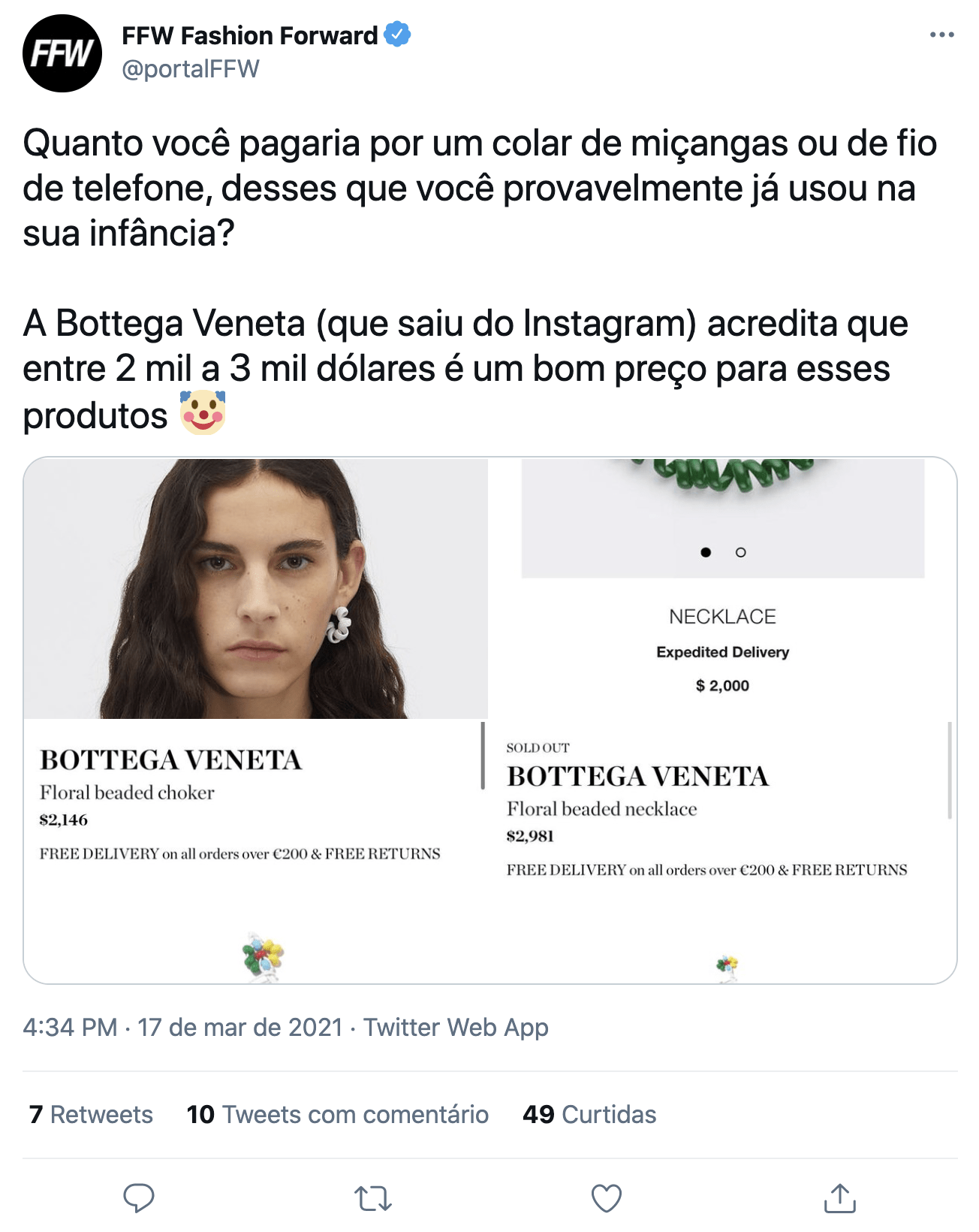 No Brasil, através do site da Farfetch, a peça mais barata da nova coleção ultrapassa os cinco mil reais (um anel), enquanto o colar mais caro da nova coleção é encontrado pela bagatela de R$ 13.952,00. Vale lembrar que já vimos uma moda parecida com isso aqui, há 8 ou 10 anos, e não se pagava mais do que alguns centavos para comprar um elástico com o mesmo estilo, por exemplo.