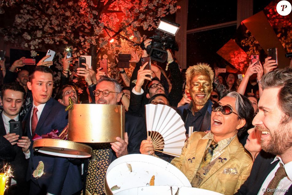Satya Oblette e Kenzo Takada na festa de 80 anos do estilista. Paris, 2019 (Foto: Bestimage, Purepeople)