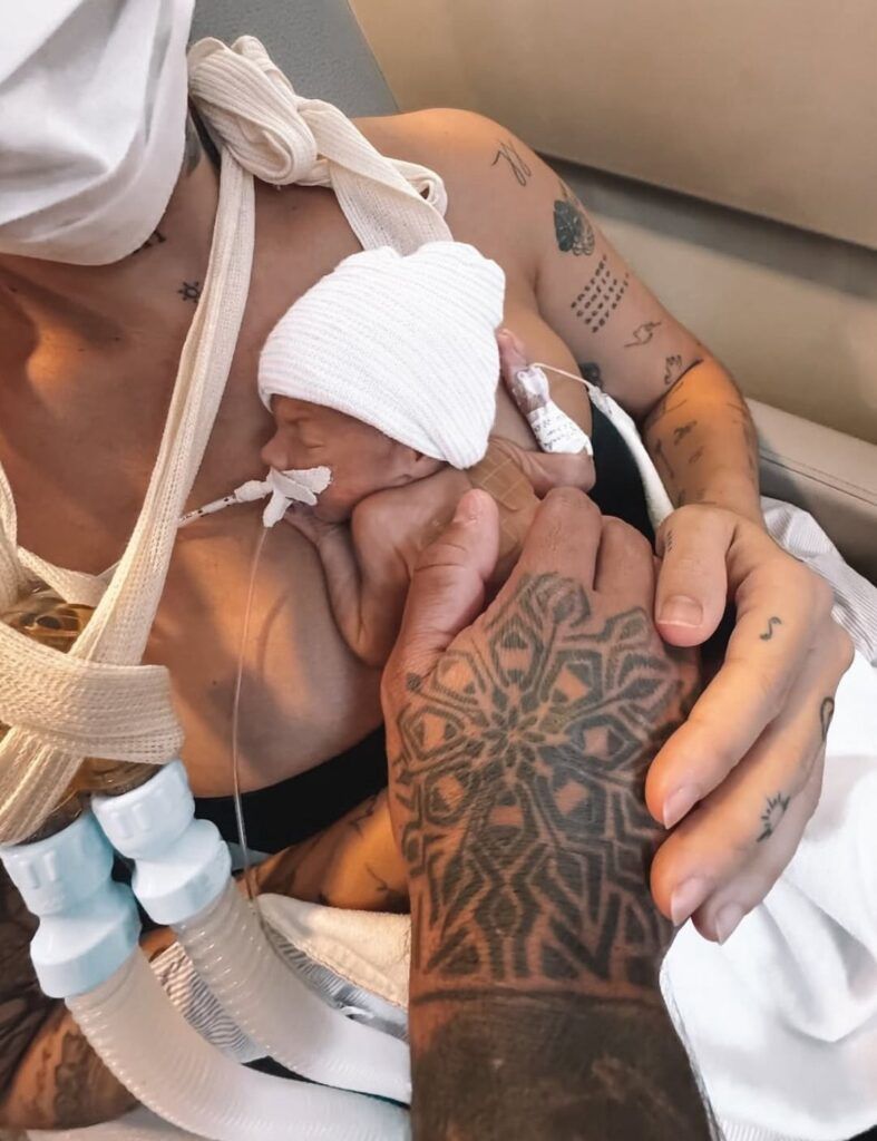 Clara Maia vive emoção ao segurar o filho Theo pela primeira vez após parto prematuro