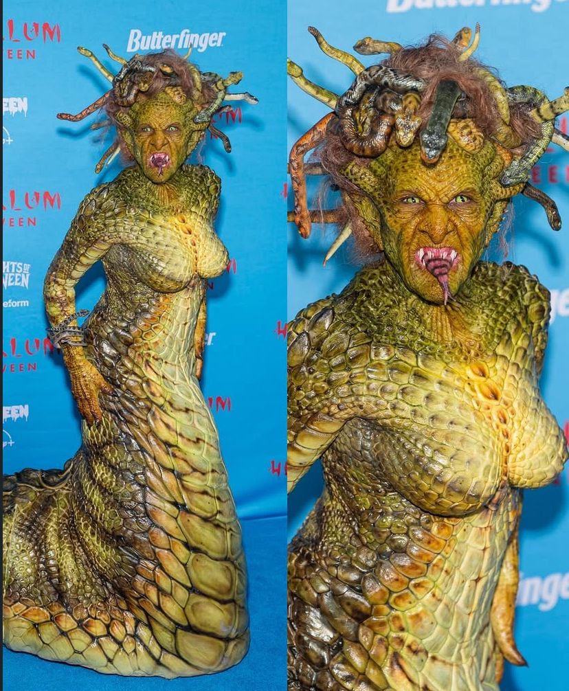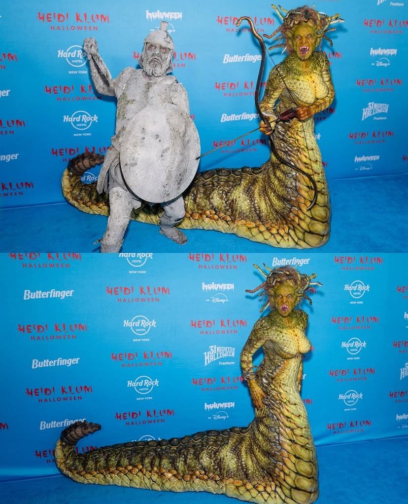 Com cobras pela cabeça, presas afiadas e uma língua pontuda digna de um filme, Heidi impressionou com cada detalhe do visual. Para completar o show, o marido Tom Kaulitz apareceu caracterizado como um cavaleiro transformado em pedra após enfrentar a criatura mítica.