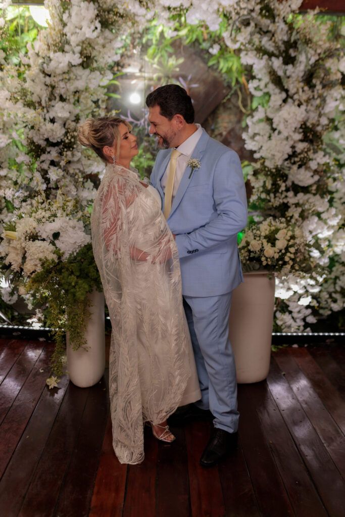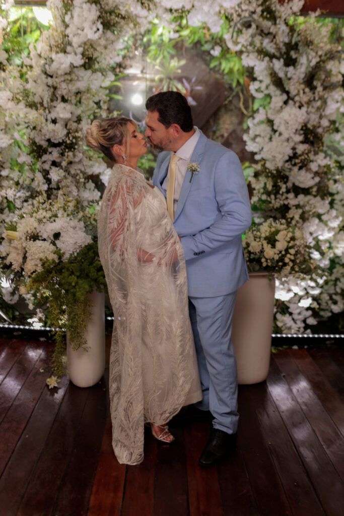 A cerimônia, para apenas 60 pessoas, entre amigos e familiares, aconteceu no restaurante Barollo. É sobre o casamento de Vanessa Lins e Leocádio Lopes. Planejado pelo promoter e amigo pessoal da família, Rodrigo Santos Bapho, pensou nos mínimos detalhes. Com ele, o expert e experiente em festas Jamil Jr fez uma decoração linda entre flores brancas, velas e iluminação sépia. Vanessa vestia um belo look com capa em renda por Tânia Castro. Belo! A make e hair foi do Evandro, do Studio Volut. A comemoração seguiu com o almoço do restaurante, e nota especial para a cocada quente com sorvete de vanilla. O clima era de alto astral e de felicidade. Parabéns ao casal!