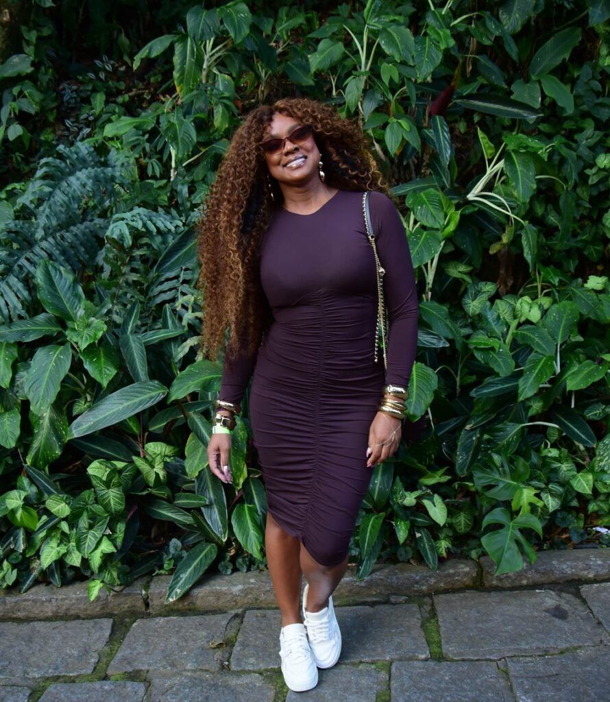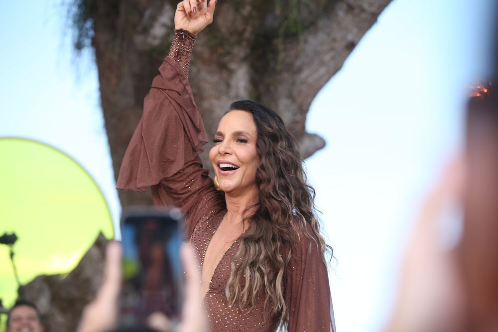 Para a gravação, a cantora escolheu um vestido curto marrom esvoaçante, que deixou suas belas pernas à mostra.