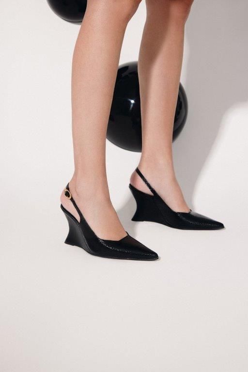 Para a paleta, aparecem as cores exclusivas rubi (vermelho) e ébano (marrom), além do preto em couro liso, que dão vida a scarpins e sandálias com saltos inusitados, flats, botas statements, cintos e bolsas.