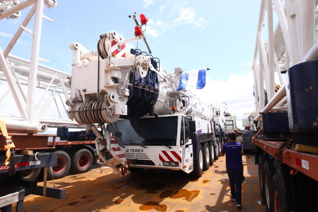 Entre os equipamentos, estão um guindaste Dacia C500, dois RTs 780, uma máquina manipuladora, seis carretas de carga com lanças para compor o jib do C500, um caminhão munck com pedras de contrapeso, uma empilhadeira de 8 toneladas e uma manipuladora com lança estendida.