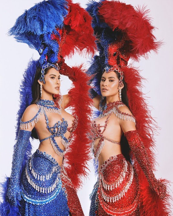 Entre as personalidades que cruzam os salões do Copacabana Palace, Isabelle Nogueira chamou a atenção ao levar a grandiosidade do Festival de Parintins para o evento. Seu look une as cores dos rivais históricos: Caprichoso e Garantido.