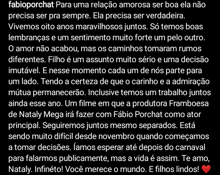 Em texto emocionado, ele explicou o divórcio depois de oito anos juntos: “O amor não acabou, mas os caminhos tomaram rumos diferentes”.